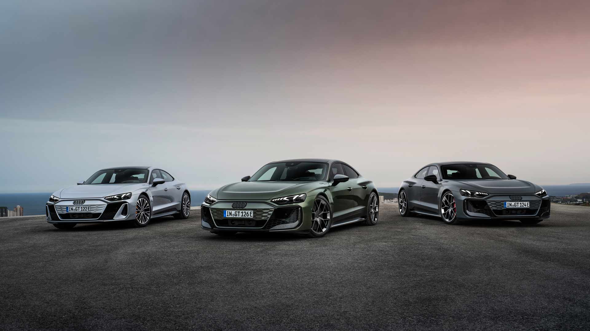 La **RS e-tron GT performance** rappresenta il top della gamma, con elementi unici come il tetto in carbonio opaco e inserti in carbonio camouflage. Tutti i modelli adottano la nuova corporate identity di Audi, con i quattro anelli bidimensionali e nuove opzioni di colore.
