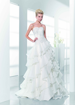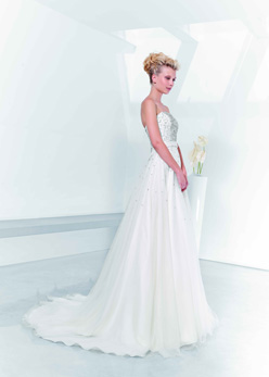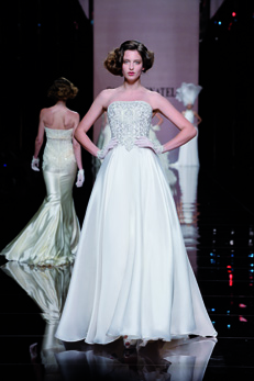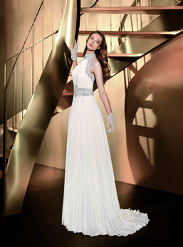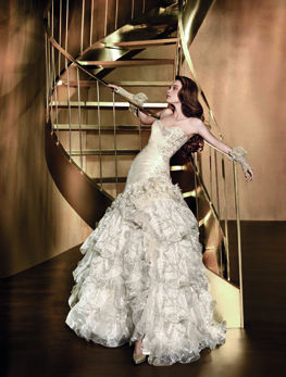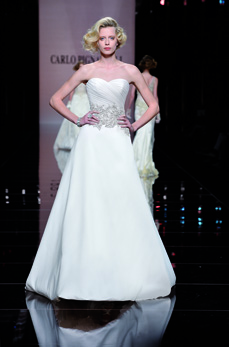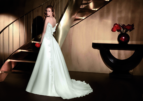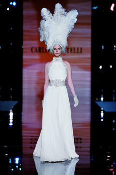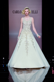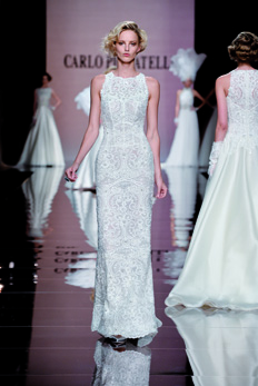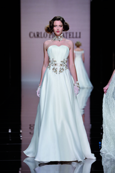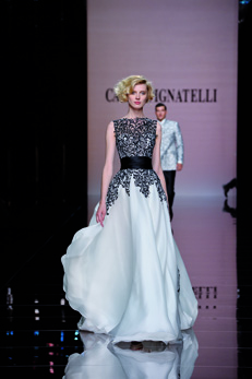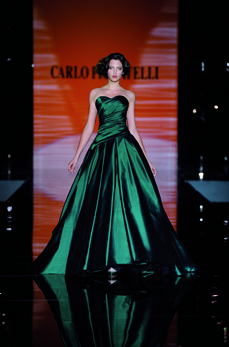 Carlo Pignatelli ama giocare con la tradizione assumendola nel suo DNA rinnovandola e rendendola pura modernità. Ma restiamo nel fiabesco mondo della cerimonia, questa volta al femminile, si perché anche per Lei Pignatelli ha il suo bel dire. Parla di una donna nel giorno più bello della sua vita, una donna avvolta in un abito da sogno che regala fantastiche silhouette; i tessuti? Rigorosamente seta, pizzo, chiffon, ai quali si aggiunge il tocco prezioso dei ricami in oro, frutto di sapienti e abili mani sartoriali, o con il geniale tocco di piccoli bouquet di seta applicati alle creazioni dello stilista. Ovviamente il tutto indiscutibilmente in bianco, avorio e champagne. Ma anche qui irrompe il verde smeraldo e l’ evergreen black e white per chi propende alla sera, senza tralasciare un eleganza che lascia senza respiro.